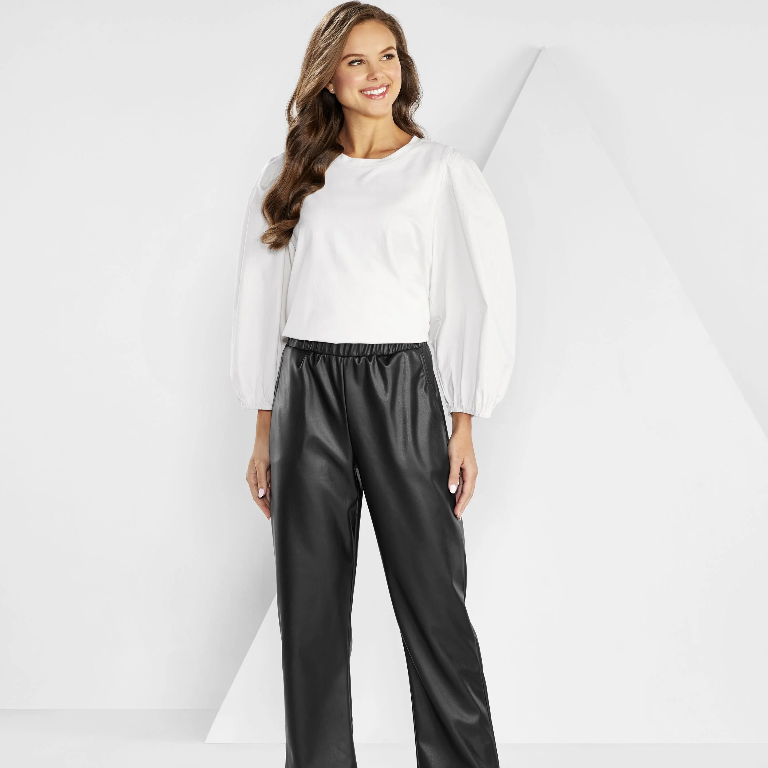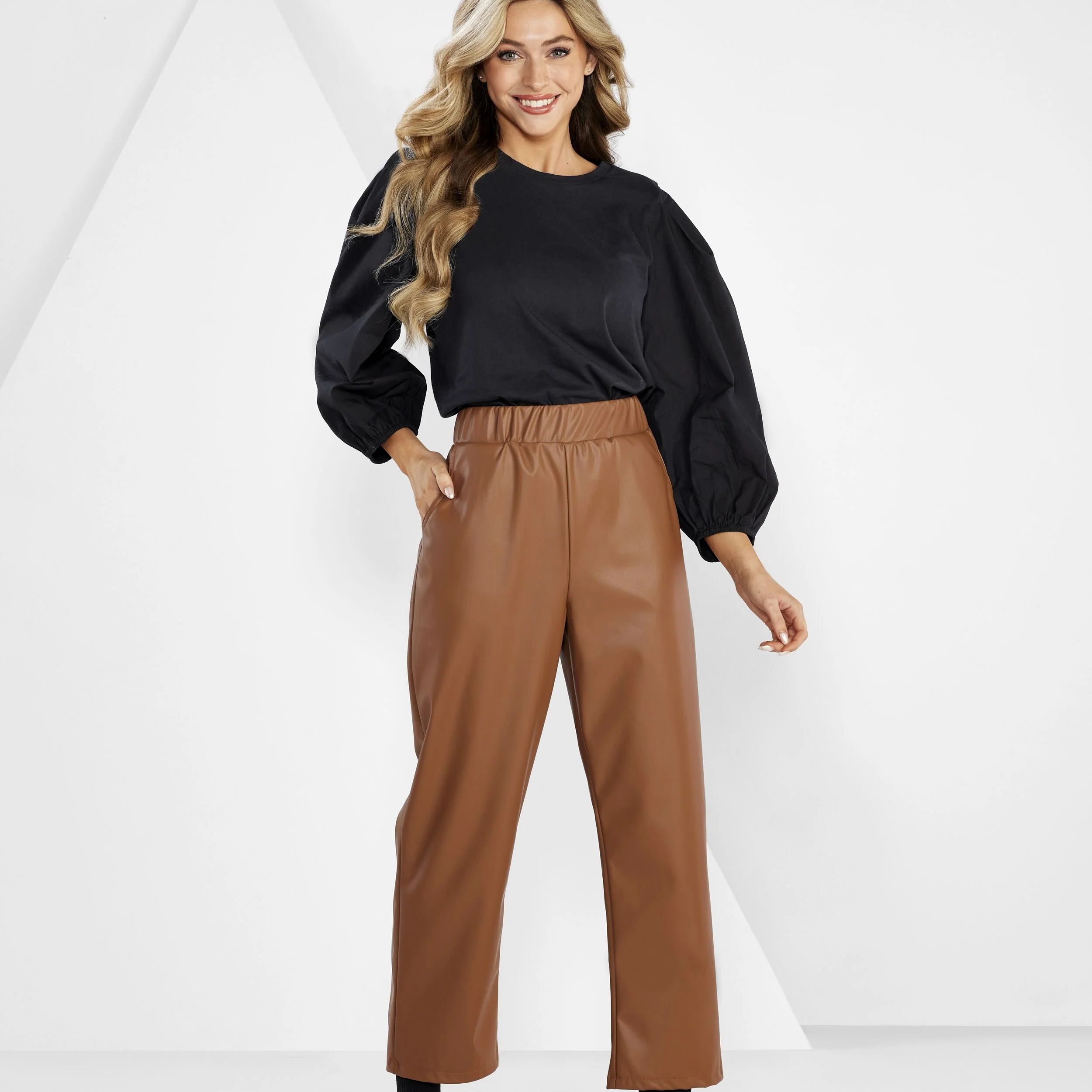 Faux leather wide leg pants with elastic waist, functional front pockets and faux back pockets inseam measures approximately 26 3/4" on size small