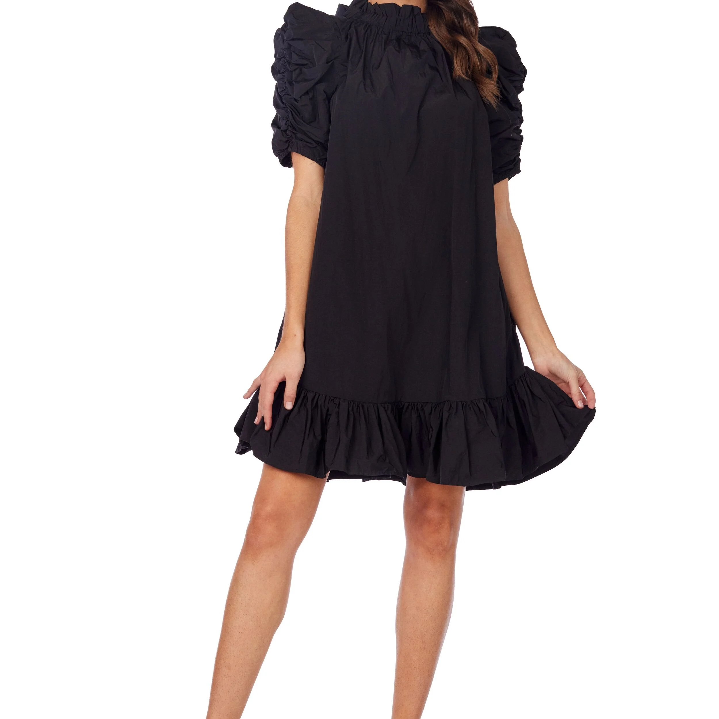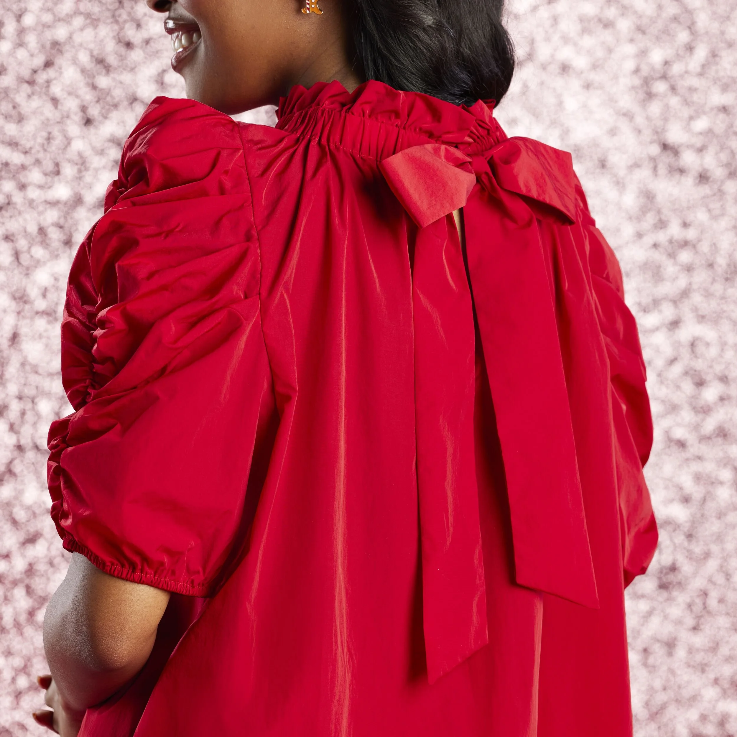 Shiny Nylon dress features gathered puff sleeves, ruffle neckline, flounce hem and bow tie at the back. Available in Black and Red