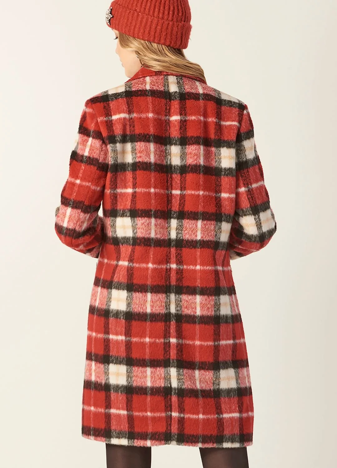 A great notched collar coat in a thick luxe brushed fabric with a wonderful soft hand in a bold red plaid, two front pockets, knee length, fully lined. Inherently functional and beautiful with an above the knee look cut in a classic shape creating a modern silhouette. Available in: Red Plaid.